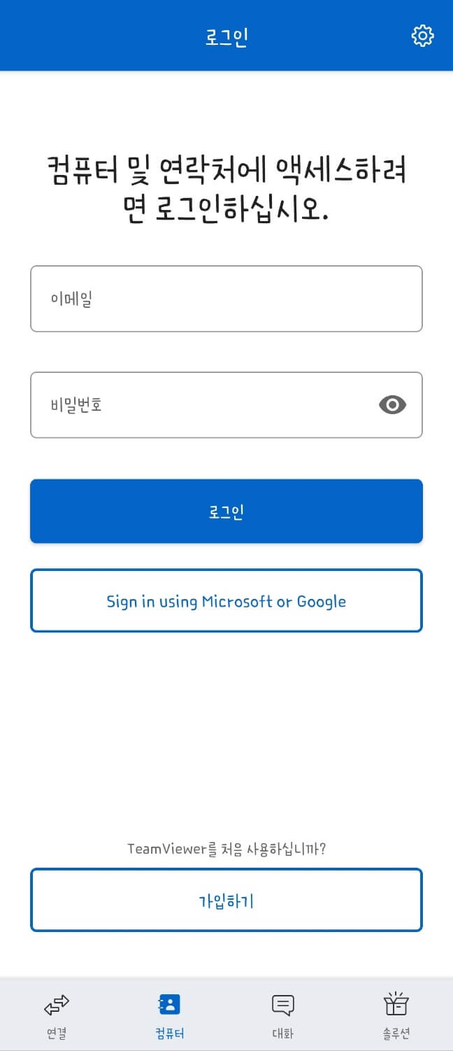 우선 컴퓨터에 다운로드 받은 팀뷰어를 실행시켜 줍니다. 그러면 위와 같은 창이 뜰텐데요. 우측 상단 로그인 버튼을 눌러서 가입을 진행해야 합니다. 구글 아이디로도 간단하게 가입 및 로그인이 가능하니 참고해주세요.